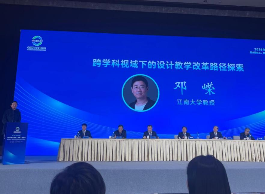 在经验交流环节中,邓嵘教授进行了题为《跨学科视域下的设计教学改革路径探索》的发言。他指出:“设计教育的革新必须打破学科壁垒,构建知识融合、产教联动的生态体系。”基于十余年的教学实践,团队构建了"课程-教材-实践"三位一体的改革体系:在课程设置方面,以"整合创新实验班"试点为孵化器,逐步形成跨学科课程群;在教学方法上推行"问题导向+校企协同"双轮驱动模式,将企业真实项目引入课堂;在实践环节中注重品牌与商业价值转化,实现人才培养与产业需求的无缝对接。