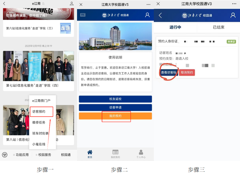 手机关注“e江南”微信公众号,点击屏幕下方“校园服务”中的“访客预约”,进入后点击“我的预约”,点击“查看访客码”即可获得访客码。进入校园时出示访客码。