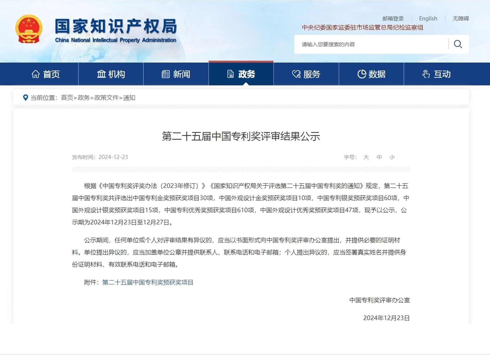 中国专利奖旨在鼓励加大高质量专利的创造和运用,由国家知识产权局与世界知识产权组织共同颁发,是我国唯一的专门对授予专利权的发明创造给予奖励的政府部门奖,是中国最高级别的专利奖项和知识产权领域最高荣誉,目前设有中国专利金奖、银奖、优秀奖和中国外观设计金奖、银奖、优秀奖。中国专利奖其评选标准不仅强调项目的专利技术水平和创新高度,更注重其在市场转化过程中的保护状况和运用情况。通过中国专利奖所反映的专利质量和效益,是体现我国高校自主创新能力的重要标志。