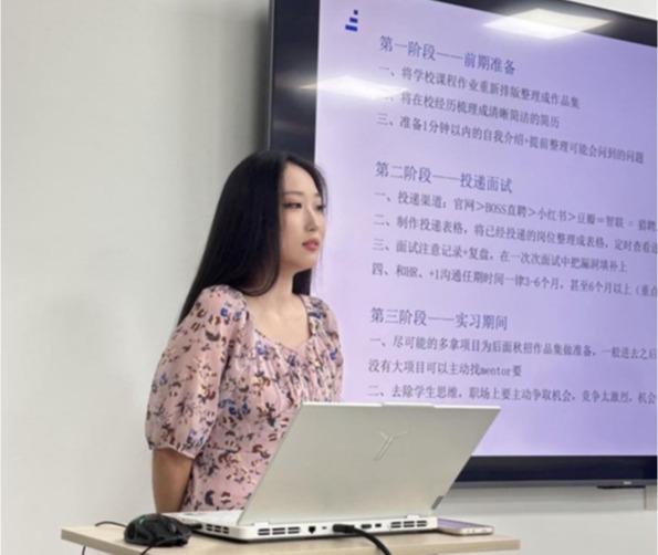紧接着由工业设计专业殷欣雨学姐开展自身经验分享,殷学姐从前期准备、投递面试、实习期间三个阶段分别展开叙述。在前期准备中,学姐建议将学校课程作业重新排版整理成作品集,在校经历梳理成清晰简洁的简历,同时准备1分钟以内的自我介绍和提前整理可能会问到的问题。在投递面试中,投递渠道方面,官网>BOSS直聘>小红书>豆瓣=智联=猎鸭。制作投递表格,将已经授递的岗位整理成表格,定时查看进度。面试注意记录+复盘,在一次次面试中把漏洞填补上。和HR沟通任期时间一律3-6个月,甚至6个月以上。实习期间,尽可能的多拿项目为后面秋招作品集做准备,同事注意去除学生思维,职场上要主动争取机会,竞争太激烈,机会很少很重要,搞好人际关系(同时减少内耗)。最后殷学姐展示了部分自己的作品集,让同学们对作品集制作方面更加了解。