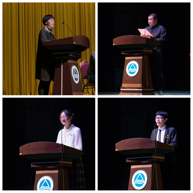 服装工程2001班蒋阗行代表本科新生发言,她愿同学们能够扎实基础,打破常规的思维,在追逐至善的人生路上永不停歇;希望同学们要以学习为主,学会自我学习,以更高的目标要求自我;愿同学们能在最好的时代引领属于他们的方向。设硕2007班赵振皓代表研究生新生发言,他希望新生们能够保持大学生涯的那份好奇心和求知欲,跳出思维束缚;吸收学习新的知识以及技术,保持设计学科交流的特色,为h动画