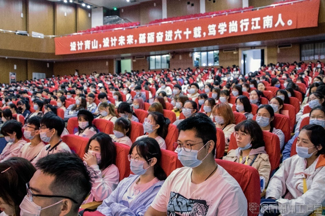 典礼仪式结束后,邱建平书记为全体新生讲授思政第一课。他围绕“深入学习党的十九大精神”、“战“疫”给我们的思考”和“设计青山,设计未来”这三个方面进行阐述。首先具体介绍了党的十九大会议主题相关内容及其精神内涵,并带领大家学习了习近平新时代中国特色社会主义思想的形成以及历史贡献;其后,结合战“疫”数据及其成果向同学们展示了中国精神、中国力量以及中国担当,充分体现了中国共产党的领导力,反映出了中国特色社会主义制度的显著优势。最后,围绕“我是谁”“我骄傲”“我设计”三个维度展开,他希望同学认真思考,紧密跟随“坚持中国特色社会主义教育发展道路,培养德智体美劳全面发展的社会主义建设者和接班人”的成才方向,做有理想、有担当的一代青年。他以4P方法即规划(plan)、实践(practice)、慧玩(play)、坚持(persist)和3D方法即梦想(dream)、坚持(duration)、卓越(distinction)的讲述提出了对同学们的要求,希望同学在h动画