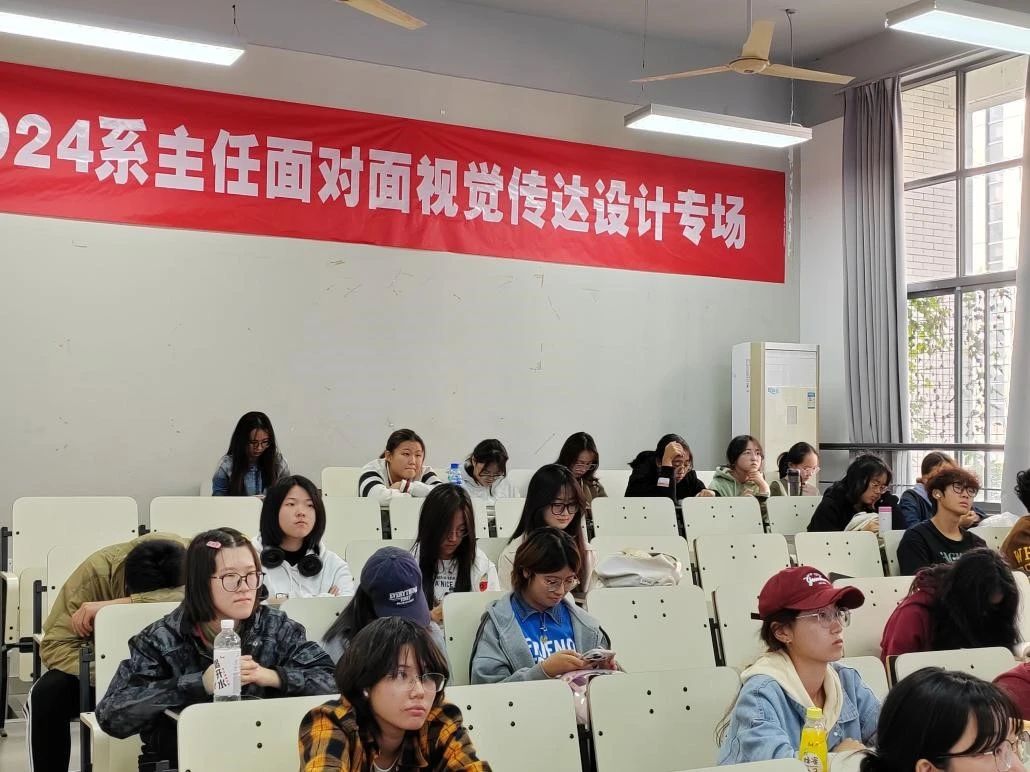 于A104教室举办了系主任面对面视觉传达专场活动。此次活动有幸邀请到视觉传达设计系主任廖曦老师、优秀研究生生代表夏晨骁学长和杨丽睿学姐,为24级的同学们带来了一场别开生面的经验分享会。活动现场反响热烈,学生们积极参与,收获颇丰。