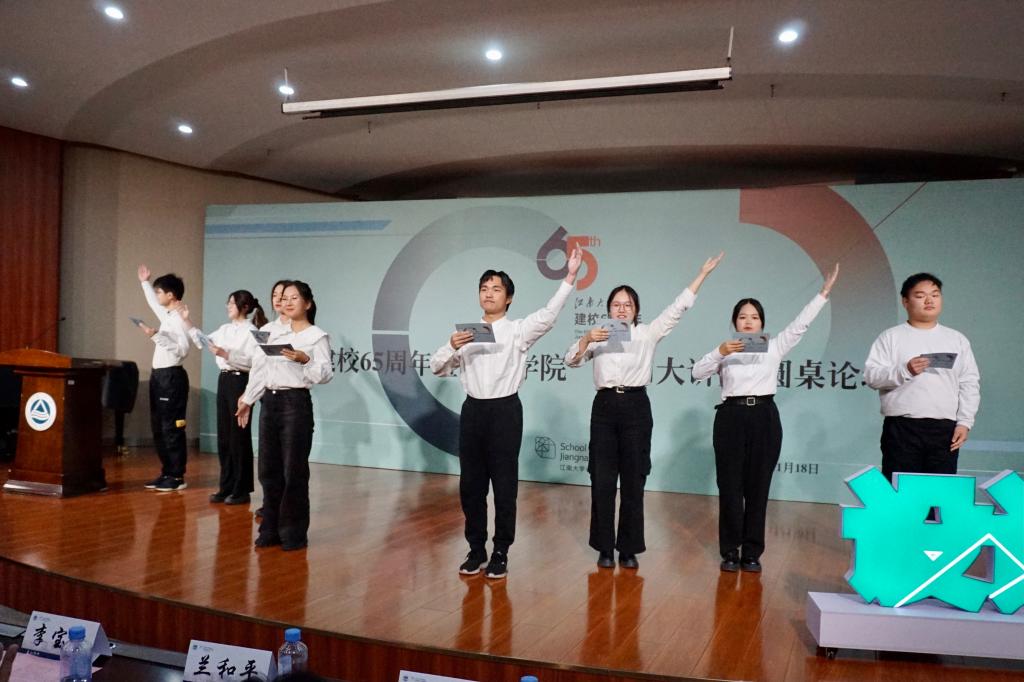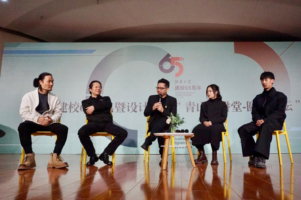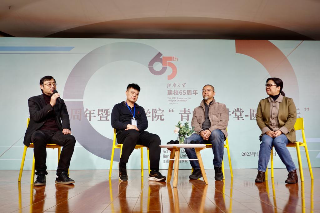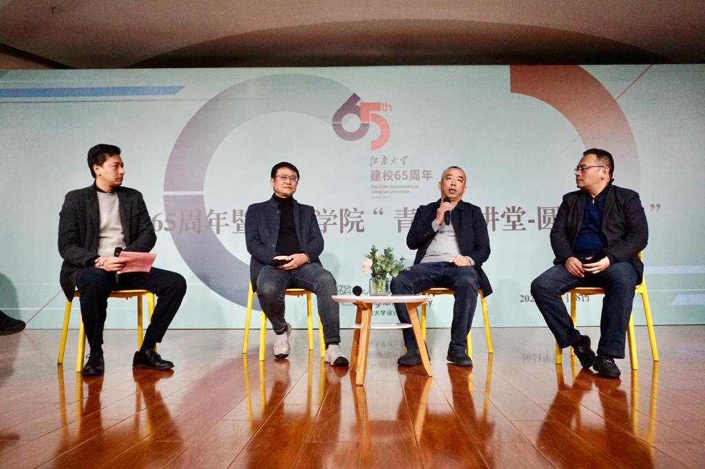 新的一代学子如何继承及发扬这种优秀文化?议题。上海设计校友会会长李宝生,秘书长林奋、校友代表葛振元、在校生设计学2023级博士潘临凡、设计学2021级硕士宋洪财分别探讨了个人观点。李宝生以校外学长的身份,代表上海校友会诙谐幽默地对学弟学妹表达了欢迎,指出社会上对设计人才仍存在很大需求,上海校友会欢迎江南设计学子加入大家庭;林奋坦言了自己在大学期间的迷茫,大学毕业后一步步克服困难,最终把握时代契机取得不凡成就的成长经历,他对同学们提出“做更好的自己”的衷心祝福;葛振元亲切指出h动画