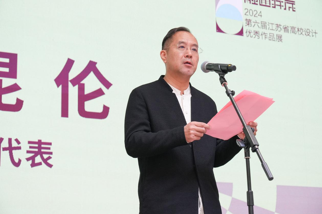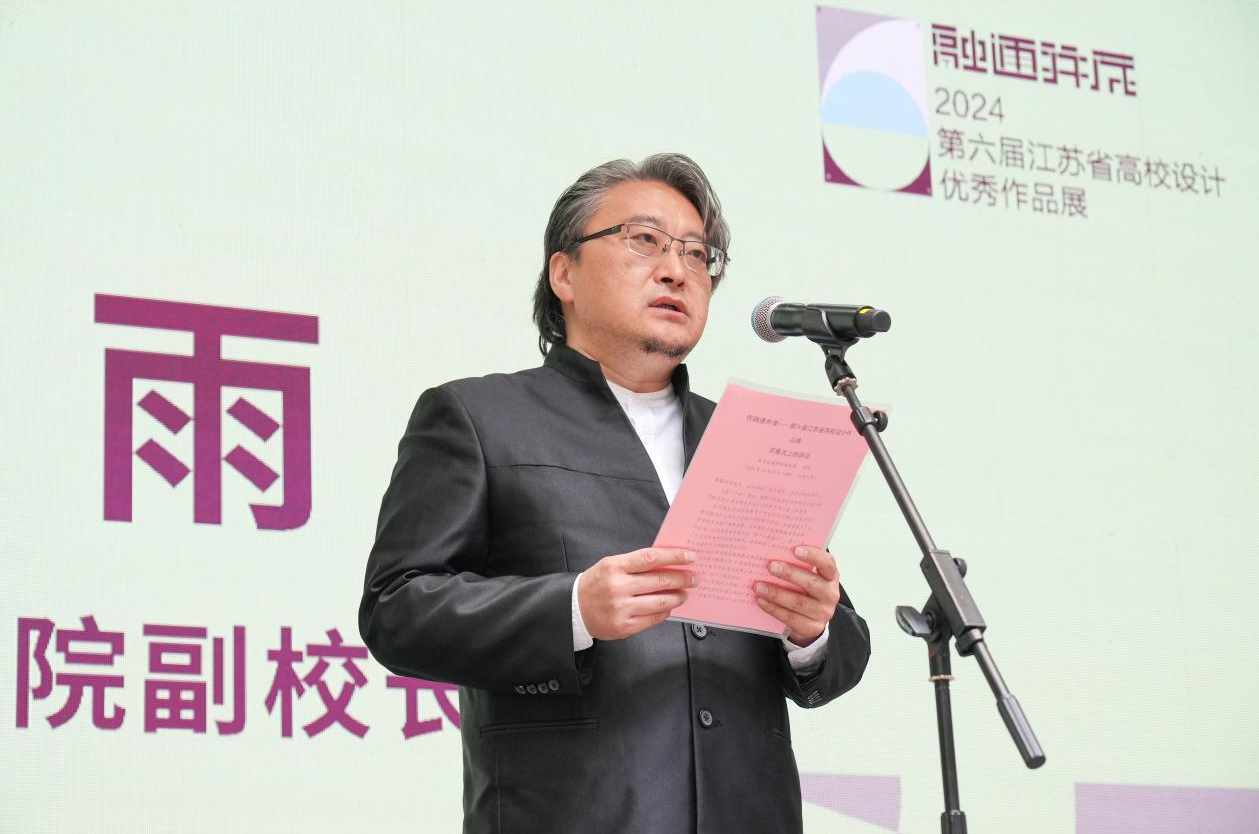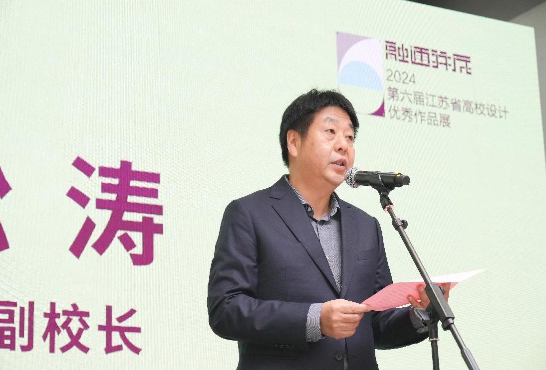 副校长倪松涛致欢迎辞。倪校长指出,今年恰逢新中国成立75周年,文化艺术在国家繁荣进步中发挥了重要作用。本次展览推动了江苏高校艺术设计教育发展,激发创新活力,为新时代文化建设贡献力量。h动画