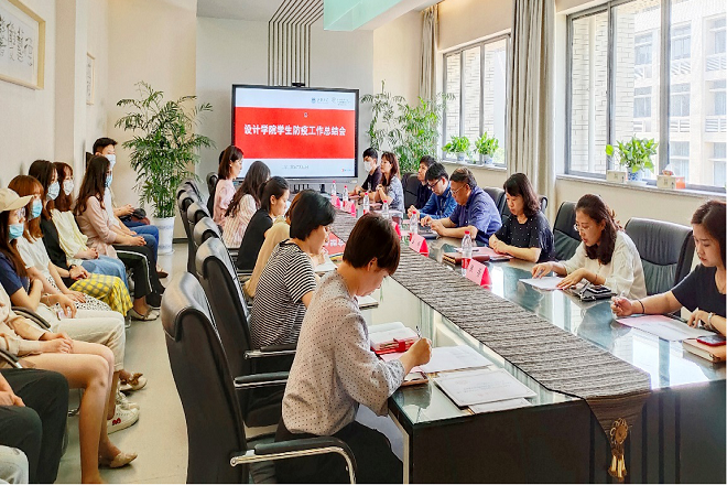 会议开始,播放了学院学生防疫工作宣传片《江南设计范,战‘疫’青春行》,从战“疫”相关设计、志愿服务、青春宣言等几个方面展现了设计学子在疫情防控期间以画传情、以艺抗“疫”的战“疫”故事。分团委书记陆芳从责任体系、管理体系、人文关怀三个方面介绍了学院的防疫工作。