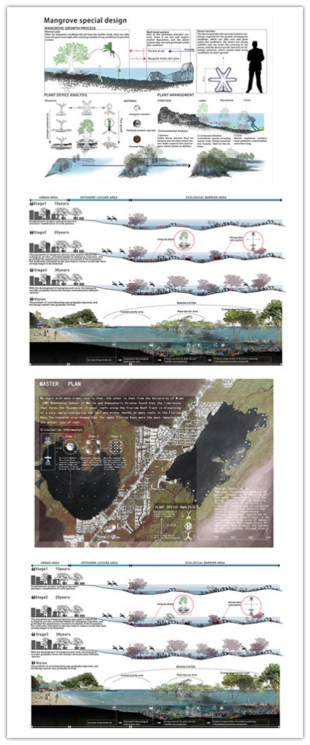 方案概述:随着气候变化导致海水温度升高,整个生态系统都将崩溃,包括珊瑚礁。这项研究并非旨在解决气候变化问题,而是着重于在地方一级(尤其是在佛罗里达礁岛礁)周围管理变化。自走式循环装置结合了风能,太阳能和潮汐能,可以测量礁石水的温度,并在水变得致命时有效地对其进行制冷。该策略还包括珊瑚水产养殖和海岸线红树林的形成,以减少人类与精致的礁石结构的负面互动的可能性,并通过玻璃走道鼓励人们放手观赏珊瑚。