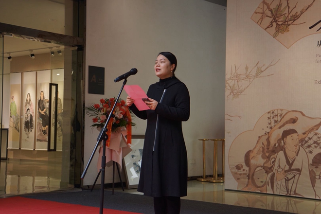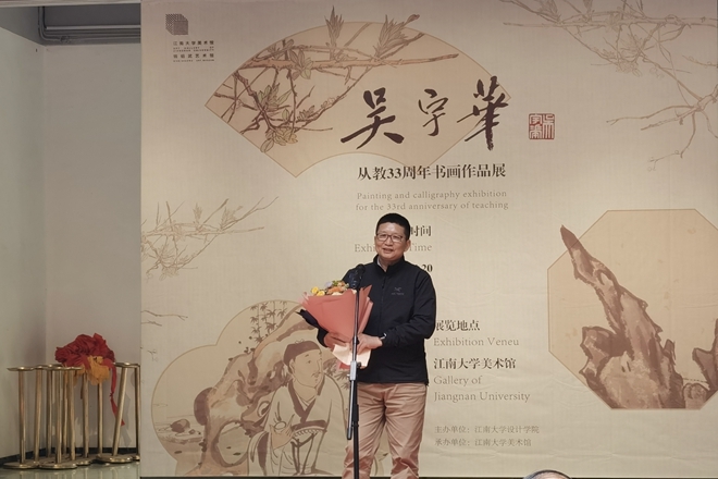 院长魏洁、无锡市美术家协会主席梁元分别致辞。魏洁院长代表学院向参加本次作品展开幕式的各界来宾表示热烈的欢迎,向悉心耕耘在教育田园的吴宇华老师表示感谢,对吴老师在高校美术教育与绘画创作工作中所取得的丰硕成果表示衷心的祝贺。魏院长在发言中期待吴宇华教授在艺术道路上继续不断求索,创作出更多的艺术佳作,为美术教育多作贡献。梁元主席代表无锡市美术家协会向吴宇华老师书画作品展的开幕表示祝贺,梁主席称赞吴老师多年来在绘画研究方面前行不懈,师法古人且融会创新,用笔墨体现了意趣高妙的审美意境,形成了自己鲜明的艺术风格,敦正清雅的品格让人赞佩,期冀他在笔墨线条的世界里勾勒出别样的精彩。之后,h动画