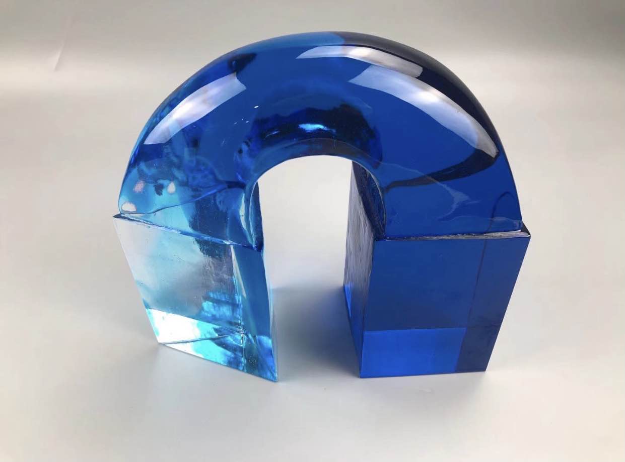 标题里“融”是指交融;“和”是和谐。两个不同的形式事物因为一种联系交融在一起,成为一种和谐的存在。左右分别是三棱锥体与长方体两种不同的形式,将其向上延伸逐渐交融在一起,形成了中间近似圆柱的部分,这就使得彼此有了联系,成为和谐。作品全身打磨抛光,呈现光滑质感,在光照射下,更显得玲珑剔透、精致透亮。选用了天蓝色和透明色两种,天蓝色从长方体一直延续到三棱锥与圆柱交汇的大致区域,然后与透明色水乳交融,整体如水一般流动,强化了长方体与三棱锥体的连接交融,增强了作品的和谐性。