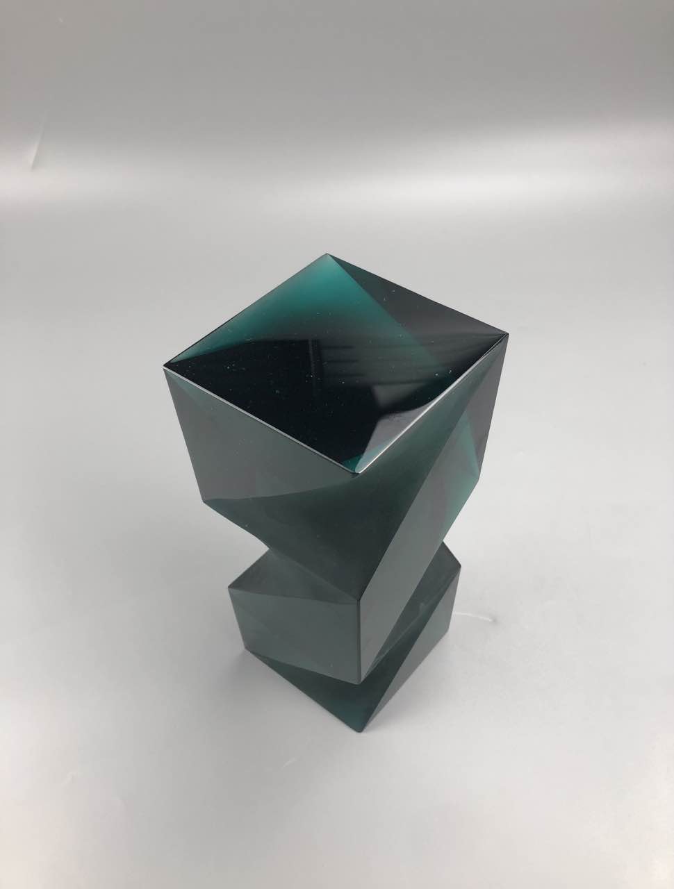 标题中“循”是遵循,依照;“规”是定方圆的标准工具,借指行为的准则。寓意看似没有规律,实际上它有属于自己的一套公式。作品将直线与曲线、平面与曲面相结合,由于玻璃材质的特殊性,可以从单个角度观察到整件作品的结构,简约而不简单。采用外层光滑和内里磨砂两种加工效果,视觉上产生对比,使作品更加丰富、耐人寻味。玻璃颜色是宝蓝色,当光透过作品时,不同的厚薄程度会映射出不同的明度的绿,使作品更有层次感。