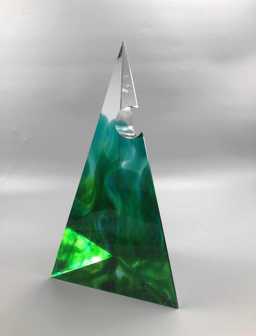 造型寓意“月满则亏,水满则溢”。选用简单的三棱锥造型。三角形是最稳定的形状,在三棱锥上做了一个圆的负型,展现出造型圆缺的美感的同时增强其造型感。作品选用三种绿色,彼此交织融合,而透明玻璃作为底色增加整体颜色的层次感,呈现了一种交织缠绕混合的混沌变化的美感。
