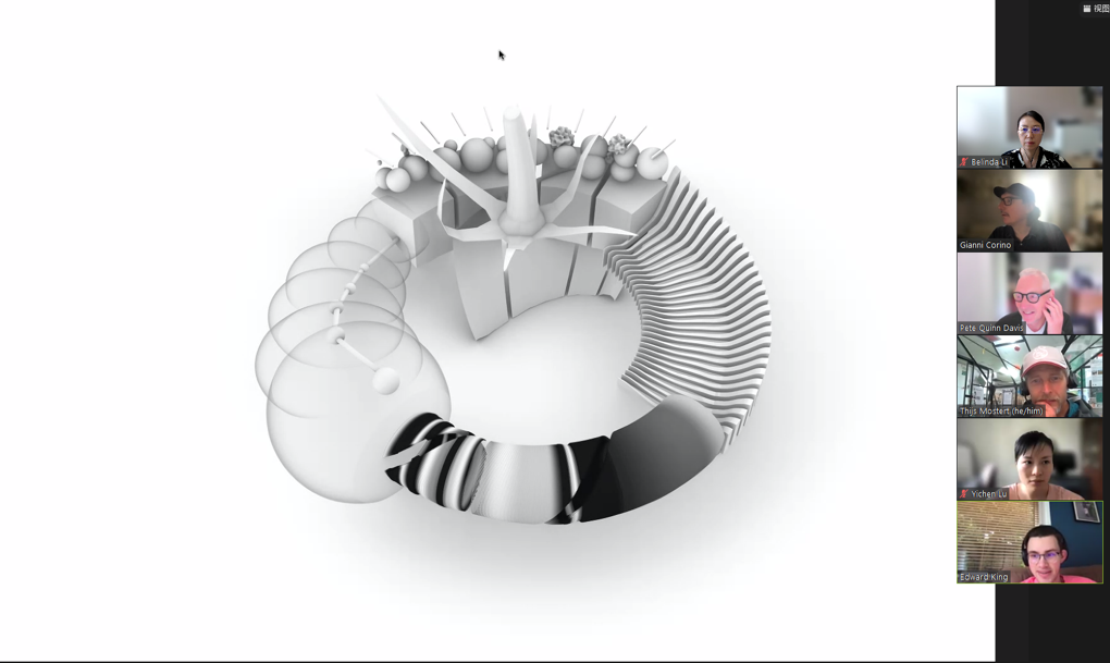 本次夏令营的主题是通过“共享、包容性参与,承载意义的数据,分布式协同”创作富有思辨内涵的数字三维人工制品。夏令营使用游戏引擎工具构建了在线协作虚拟环境—Ludic-Architectures(游戏建构),师生在虚拟环境沟通交流,与虚拟物体进行交互。6月28日,在中英双方老师的指导下,四组跨国团队进行头脑风暴、深入调研并聚焦主题,并着手开展数据的整合处理与三维模型协同创作。6月29日,爱丁堡大学设计信息学系主任Chris Speed FRSE教授也为师生们带来题为“Data-driven buildings and things”(数据的魔力)的极具前沿性和启发性的讲座,强调日常生活的信息数据可以启发设计造型表达,为生活增添有趣的魔幻色彩。