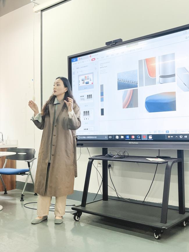 硕士毕业于英国皇家艺术学院纺织品专业的周颖青博士给学弟学妹们分享了她硕士期间在英国工业设计公司Tangerine色彩材料工艺(CMF)设计岗位的实习经历以及博士入学前在深圳华为担任平板CMF主创设计师的工作经历。通过自身参与的HUAWEI Mate pad11, Mate bookE等多项案例,周学姐向学弟学妹们展示了CMF设计在产品设计中的重要性。