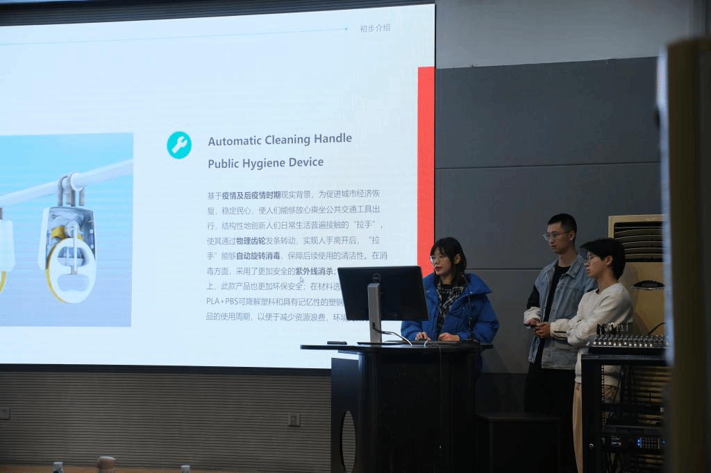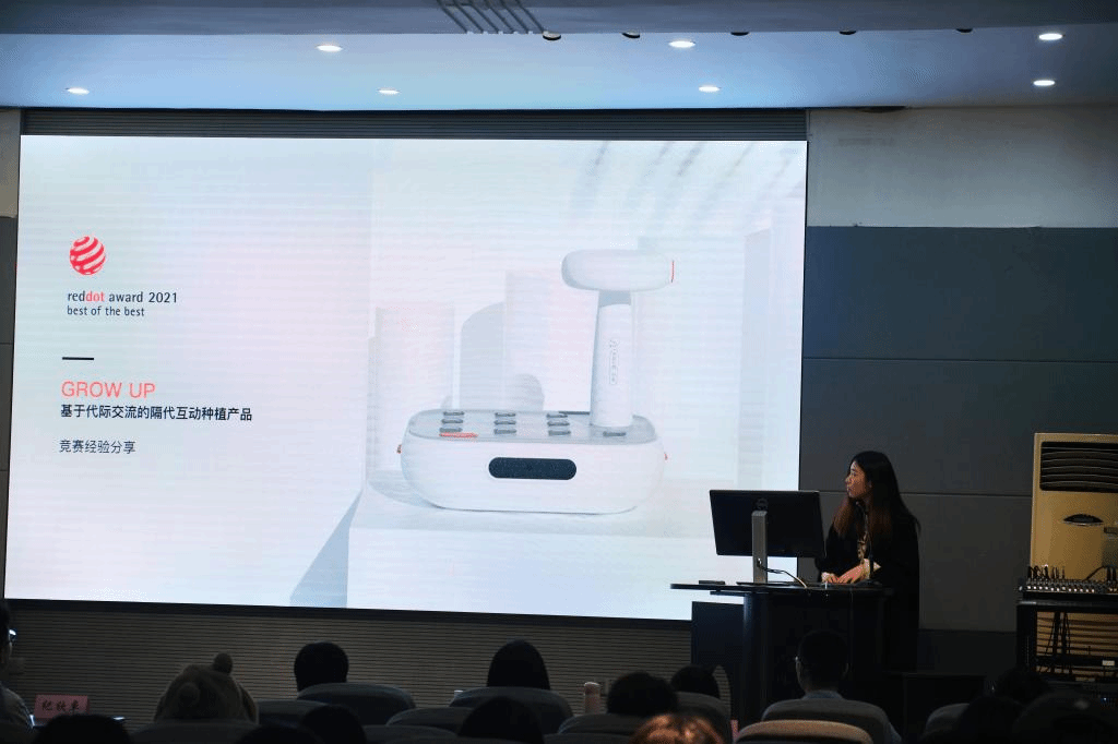 最后张琳涵、徐洋、夏晨骁以IF新秀奖为例分享了跨专业合作比赛的经验和历程,他们从团队组建、时间安排、寻求导师、合作期间的任务分配和任务执行为同学们提供了一些建议,同时详细地分析了作品设计的思路和步骤,以及设计过程中遇到的困难和克服的方法,并向大家分享了值得收藏的设计类公众号和网站。