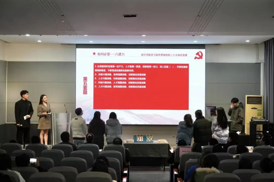 经过初赛激烈角逐,共有7支党支部与1支团支部脱颖而出进入决赛。决赛环节分为“有问必答”“眼疾手快”“扭转乾坤”三个环节,通过必答题、抢答题、挑战题等多种形式考察选手对党的二十大报告的掌握和理解程度。最终本科联合第三党支部荣获一等奖,交互设计党支部荣获二等奖,创业党支部和博士第二党支部荣获三等奖,本科联合第四党支部、20硕第三党支部、21硕第三党支部和环艺2103团支部荣获优秀奖。