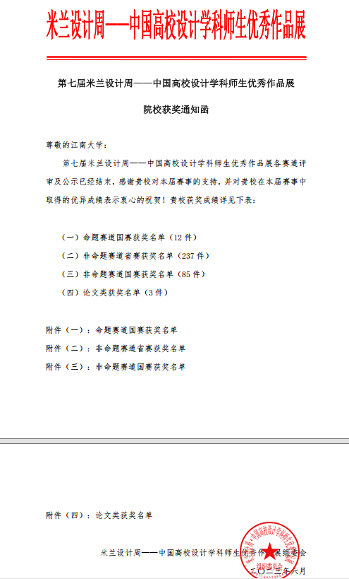 近日,由中国教育国际交流协会、中国高等教育学会联合主办,中国教育国际交流协会承办的第七届“米兰设计周——中国高校设计学科师生优秀作品展”国赛获奖名单正式公布,设计学子的参赛作品脱颖而出,成功斩获一等奖31项,二等奖22项,三等奖44项,实现了在该项赛事中的历史性突破,赛事组委会向学校发来获奖函表示祝贺。