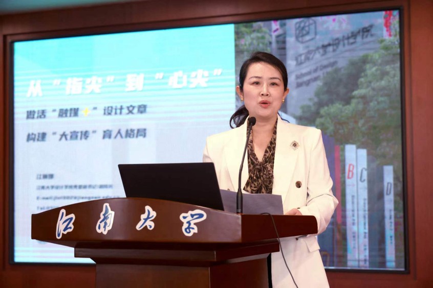 党委副书记兼副院长江琳娜以《从“指尖”流淌到“心尖”,做活“融媒+”设计文章,构建“大宣传”育人格局》为主题做了“时代新人铸魂工程”建设经验分享,她从融“宏大叙事”与“微小视角”,让“中国红”更加鲜艳;融“布局破局”与“鲜活故事",让“江南绿”更加盎然;融"整体联动"与"重点发声",让“设计黄”更加动人三个方面为大家分享了h动画