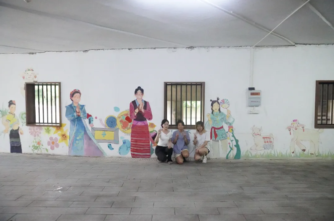 “你再多加几个层次,让苗族少女的银饰更加立体”。7月5日,在35℃的炎炎烈日下,实践团成员正式开始墙绘项目。墙绘期间,同学们迎着朝阳,伴着晚霞,和烈日较量,和暴雨赛跑,从炭笔一步步描边、颜料一笔笔修型、到丙烯一点点填色……汉族、傣族、蒙古族、苗族等民族青年形象栩栩如生。好一幅民族大团结的图画!