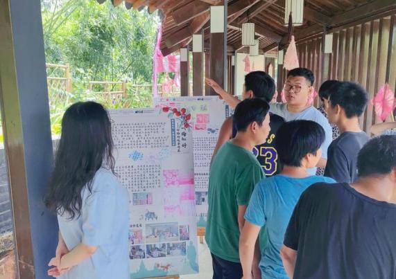 8月14日上午,烈日当空,“相约‘梅’好”实践团成员们顶着34℃的高温天气在古竹诗廊中布置展览,利用诗廊得天独厚的蜿蜒设计将展板错落摆放,与当地特产、扎染作品、与文创周边实物相得益彰。粉色的扎染布料悬挂在鱼鳞般的瓦片下,阳光透过长廊外的竹子缝隙中洒下,照在美丽的扎染布料上,微风拂过,竹影若隐若现,为整座长廊增添了一份别样的意境。下午,“杨梅古韵”展览正式开始,展览分为“古竹时光”“杨‘梅’吐气”“扎染生花”“文创周边”四个主题。一走进长廊,好似穿越到了一个由古竹文化与艺术创意编织的梦幻世界,每一块展板都是一处充满奇思妙想的空间,有无数美妙的惊喜等待发现。这一创意长廊也吸引了很多居民和小孩子,实践团成员们生动形象地讲解了古竹的历史、杨梅文化与扎染艺术的力量,分享了扎染过程中的趣事,其中,以天然竹林为背景的杨梅打卡区吸引了大家的驻足拍照。“哇,真的好美呀”、“今天真的学到了不少知识”“谢谢h动画