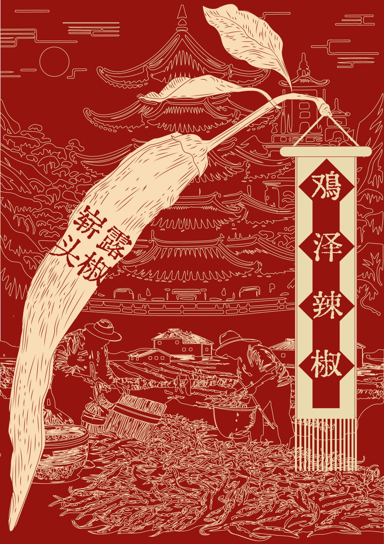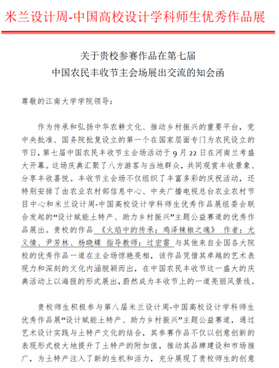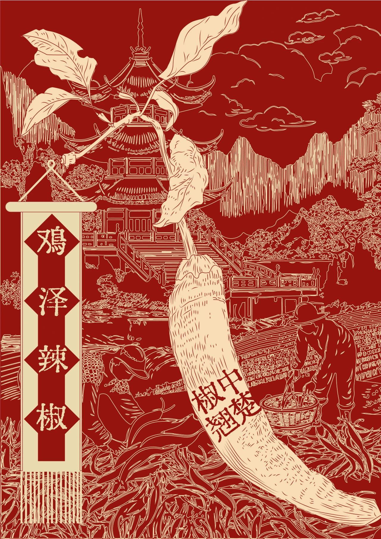 师生作品《火焰中的传承:鸡泽辣椒之魂》(尤义情、尹芳林、杨晓蝶;指导教师:过宏雷)凭借其卓越的艺术表现力和深刻的文化内涵脱颖而出,在这次庆典活动上以海报的形式展出,蔚然成为丰收节上的一道亮丽风景线。米兰设计周-中国高校设计学科师生优秀作品展组委会向学校发来获奖函表示祝贺。以中国传统版画形式为灵感,这组海报旨在展现鸡泽辣椒的独特魅力和激情,同时突出其作为传统土特产的历史和文化传承。这组海报旨在通过传统的艺术表现形式,将鸡泽辣椒的独特之处和文化内涵传达给观众,引发对于传统土特产的关注和热爱。同时,也表达了对于传统艺术形式的珍视和传承,展现了中华传统文化的魅力和生命力。
