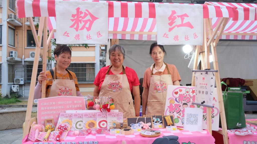 夕阳西下,六个摊位在广场上依次亮起,晚风轻拂,吹动着摊位上精巧的手工艺品。这些作品出自社区粉红奶奶们之手,而精美的包装设计则来自h动画