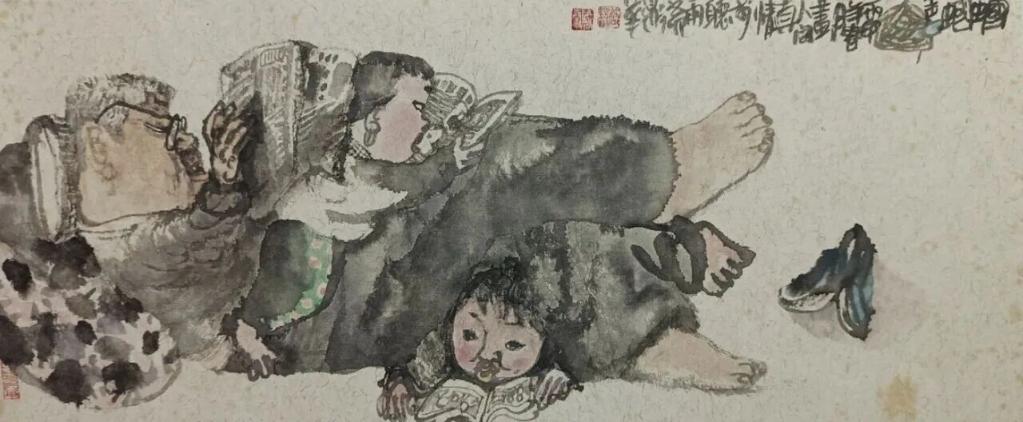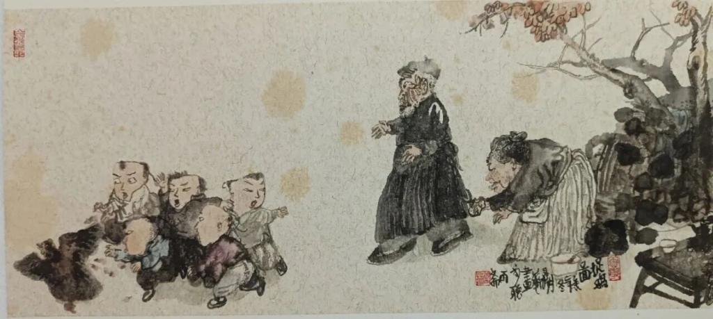 唐鼎华的创新国画围绕“童年”与“趣”巧妙构思,呈现出一派天真烂漫的艺术意趣,再通过笔下各色人物的组合,表现出了手足情、同窗情、爷孙情,母子情等。从中观众可深深体会到作者心灵深处人文思想的流露,感受到这就是展览的灵魂: “情”,有了情才有爱才有善的展延。展览中部分是作者的捐赠作品,大致涵盖了作者的创作历程,反映了他在艺术道路上反复摸索、悟道的艰辛。展览中还有部分是他的架上连环画作品。它们讲究文学性,注重情节设计及人物关系,由此阅读性强,“有看头”。