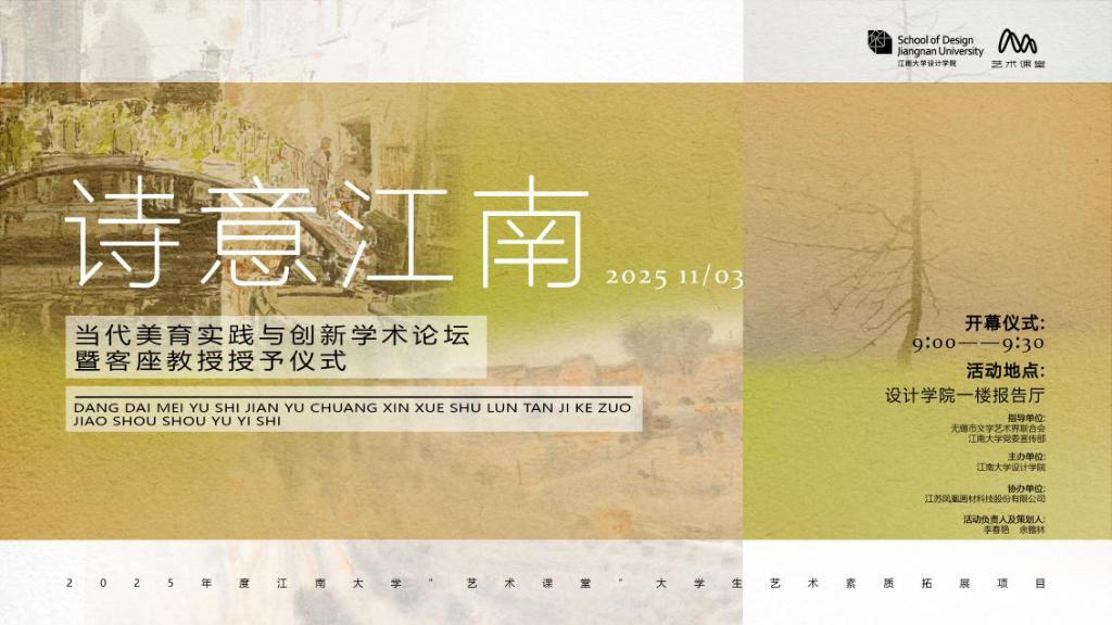 “诗意江南——当代美育实践与创新”论坛以江南文化为精神内核,致力于构建理论、实践、展示三位一体的学术交流体系,设置了名家进校园美育系列活动、无锡文艺大讲堂、江南水彩创作研修系列活动三大板块,通过传播美育理念、提升创作能力、赋能艺术探索,将艺术理论与实践创新协同发展,旨在为艺术从业者和艺术爱好者提供一个提升艺术素养的优质平台,充分展现艺术教育浸润心灵的重要价值,让江南文脉在当代美育实践中焕发蓬勃生机,为中国特色美育事业高质量发展贡献力量。