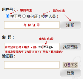 网上缴费平台”,完成缴费。考生账号已开通,切勿自行注册。收费标准:80元/生(仅申请考核考生,硕博连读考生无须缴费)。用户号在“学工号”输入正确的身份证号,初始密码(9位):“BS”+准考证编号后4位+“@fs”(准考证查看网址://yzgmis.hanime3d.net/zsgl/bswb/login.aspx),如“BS1234@fs”。非首次登录缴费系统的考生(含往年报考考生及误注册考生)请使用“找回密码”,登录并缴费。