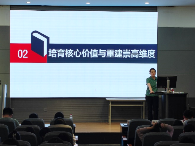 党委副书记江琳娜以《新时代的青年价值观和信仰》为题为与会党员带来大学时期的最后一节党课。她以《共产党宣言》中有关“利己主义”的内容开篇,以经典引发共鸣,随后通过“原子弹爆炸成功”和“娱乐圈明星结婚”的两种官宣对比,生动诠释了当代大学生应“拒绝精致利己与娱乐至上”的观点,又通过李桥铭和徐凯文的例子向大家传达“信仰不能太世俗,要有终极关怀”的理念。最后,她以“家长和老师之间一封信”的小故事,以小见大,着重强调了培育核心价值观与重建崇高维度的重要意义,并借此对同学们提出三点期望:一是坚定信仰,知责于心,永葆党员本色;二是文明离校,担责于身,昂首阔步新程;三是干事创业,履责于行,勇做时代先锋。