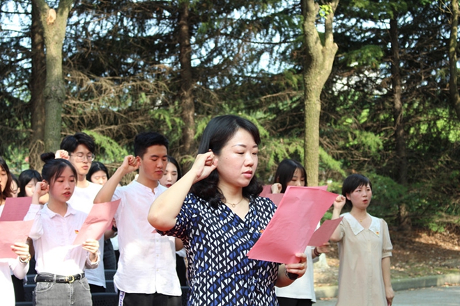 党委书记邱建平、副书记王晖、专职组织员陈祥洁、分团委书记吴雨琛和辅导员章琳列席,105名新党员共同参加,仪式由辅导员郑倩倩主持。
