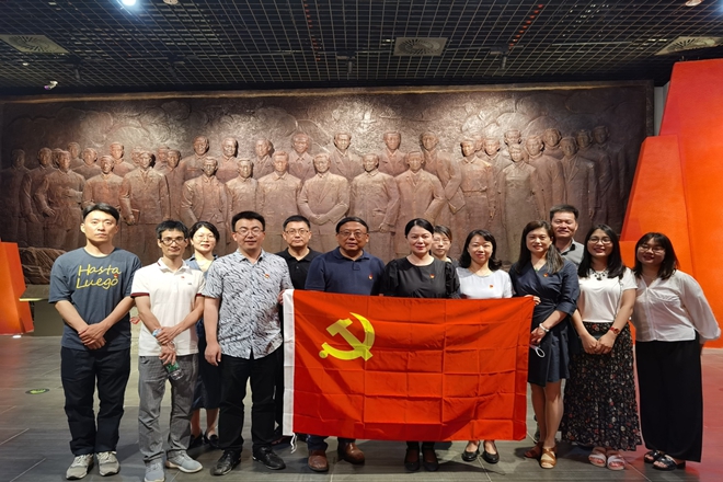 一行人首先参观了“肩负民族复兴期望的无锡人”专题展区,聆听了包括陆定一、秦邦宪、王选、荣毅仁等在内的13位在民族复兴大业中做出卓越贡献的无锡籍仁人志士的革命史、奋斗史,通过一件件历史文物和一个个生动的故事,深切感怀了先辈们为祖国、为民族发展奋发图强的奋斗精神和为国为民不惜牺牲一切的坚定品格。随后,一行人透过“血与火的城市记忆——无锡革命简史”专题展区,了解了无锡人民在中国共产党领导下进行新民主主义革命的艰难曲折历程,和从五四运动直至无锡解放的壮丽历史画卷。在鲜红的党旗下,全体人员在党委书记邱建平带领下,重温了入党誓词,坚定入党初心。