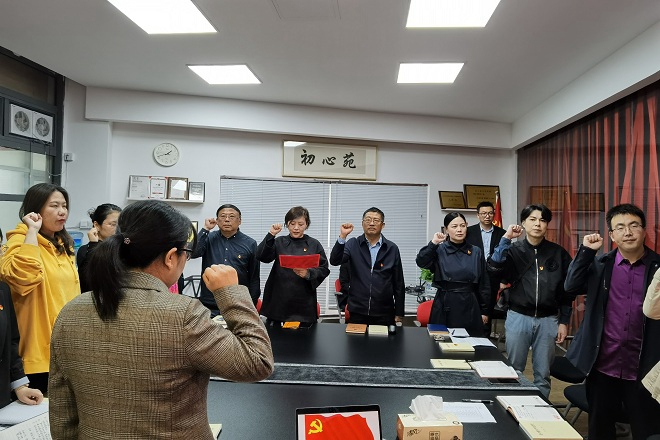 校友山奇为党的百年华诞创作的《在党旗下》的视频,跟随歌曲和画面,共同回顾了党从成立到今天的风雨征程;与会人员还通过视频聆听了山奇校友作为一名老党员分享的《在党旗下》的创作初衷和对党的忠心赤诚。随后,全体与会人员共同在党旗下,重温了入党誓词,重温了入党之时的坚定信念。视觉传达系青年教师李振宇作为入党积极分子,在党旗下庄严的宣读了入党申请,表达了对加入中国共产党的向往之情。