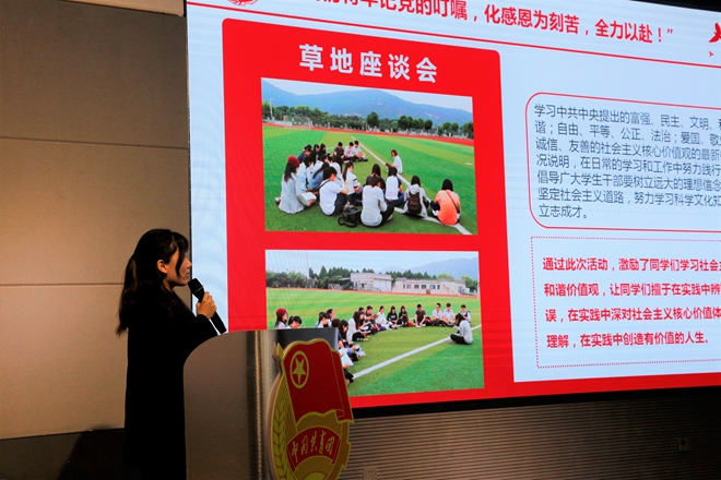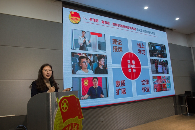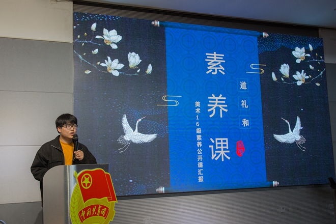 大会第二项议程是由2015、2016级团支部做经验分享。视传1503的崔秋荧从思想、学风、支部活动、成果等几个方面回顾了团支部四年来开展的各项活动与取得的成绩。该支部重视对青年学生的思想引领,组织团员观看《习近平的七年知青岁月》、开展专题学习会、举行草地座谈会,并且在老师的指导下完成了三次展览。美术1602的韩煜以素养公开课——“道礼和”为例,从主题策划、活动展示、活动成果、经验总结四个方面为大家展示了主题教育活动如何策划开展,让在座的团支书受益匪浅。