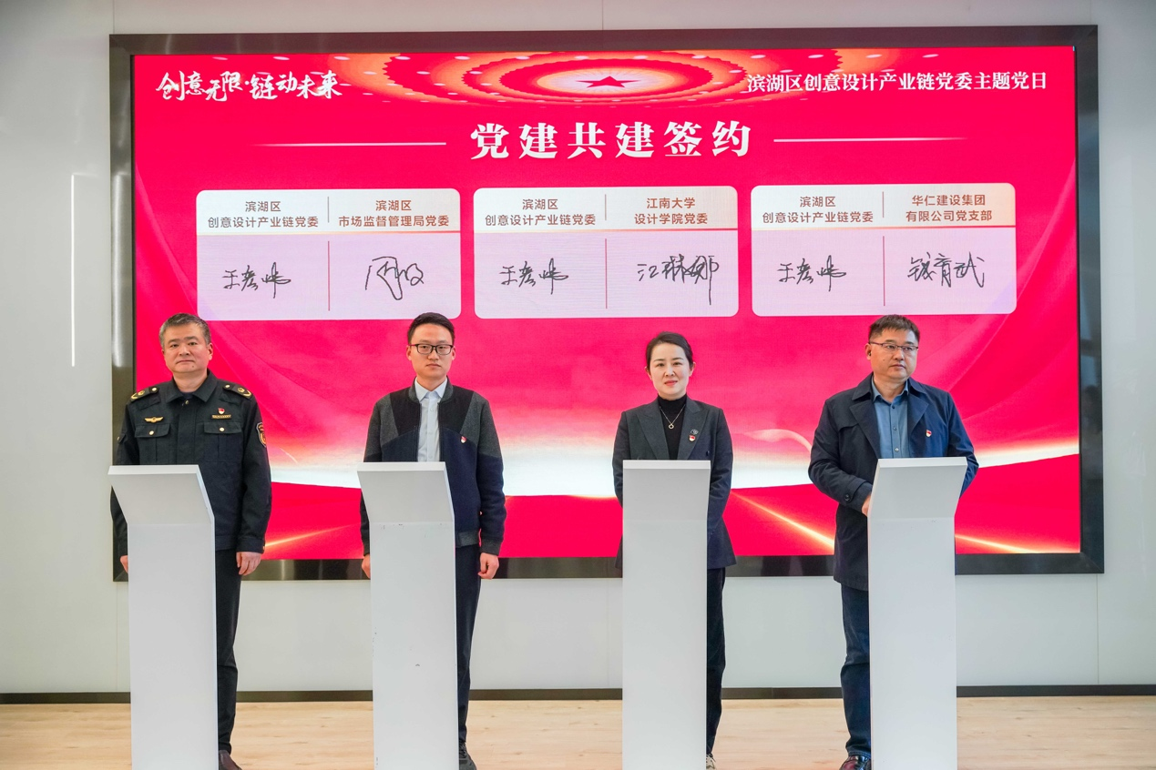 会上,王维青与滨湖区市场监督管理局党委书记、局长王巍,蠡园开发区(蠡园街道)党工委副书记、政协主任李东生,华仁建设集团有限公司党支部书记、董事长袁霞等共同为滨湖区创意设计产业链党委“五彩”链盟揭牌。江琳娜代表h动画 党委与滨湖区创意设计产业链党委、滨湖区市场监督管理局党委、华仁建设集团有限公司党支部签订党建联盟协议,为进一步加强创意设计产业链上政、院、企各方党建共建合作交流提供平台保障。